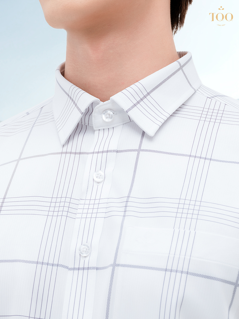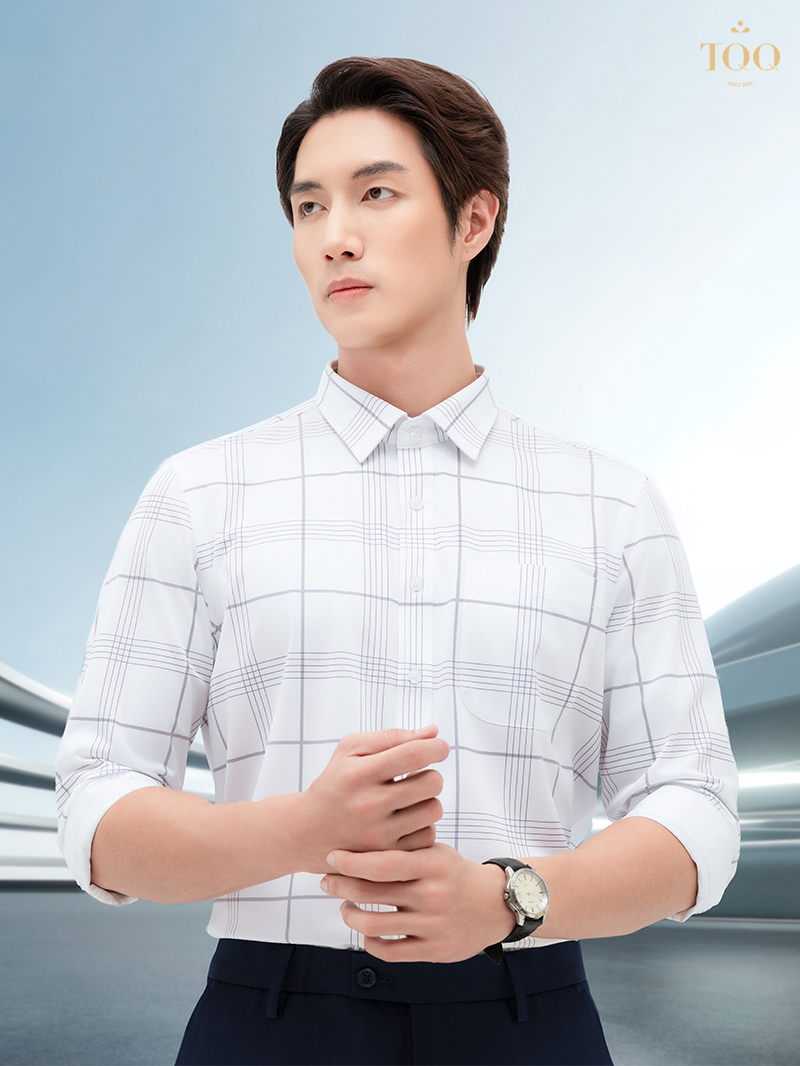 – Thiết kế cổ áo cứng cáp, vạt bằng, có túi ngực